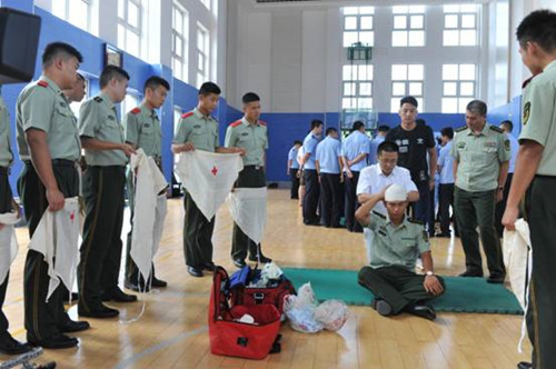 张玲主任用通俗易懂的话语,为大家上了心肺复苏的理论讲课,精彩生动的教学视频,现场真人版海姆立克急救手法演示,赢得了在场警卫人员的阵阵掌声。紧接着,张亮医生图文并茂的将平时接诊创伤患者中存在的误区进行了详细讲解,大家认真听讲并仔细记录。操作互动环节,急诊医护人员分四组演练创伤操作、心肺复苏术和体外除颤仪的使用,每一组由我科两名医护人员担任指导老师,每组操作完毕之后,大家交替、轮换进行,警卫人员整齐划一的着装、高昂的学习态度,那边喊着:“同志、同志,怎么了?”这边:“吹起来了、吹起来了”大家你追我赶、你强我更强的学习态度,也渲染了我急诊科人员,张主任、王护士长一组组的解答着大家的问题,他们以高标准的学习态度也向我们展示着军人的英姿飒爽,不知不觉中,三个小时过去了,此行的讲课也进入了尾声……